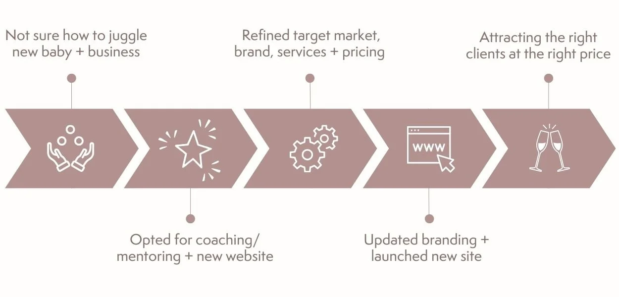 Through our 1:1 work inside Unleash Your Potential, we focused on helping her get a better handle on the business as a whole... especially the finances, pricing, efficiency and decision-making that would support a more confident return to work.