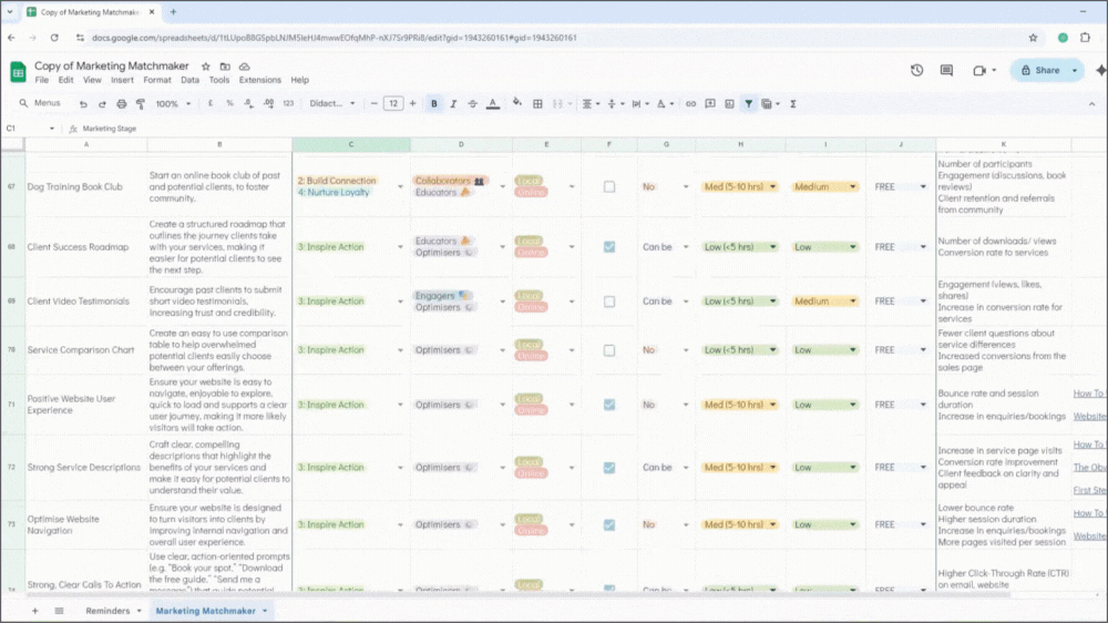 my Marketing Matchmaker spreadsheet, which allows you to filter 100 different marketing strategies to find the right ones for you and your business
