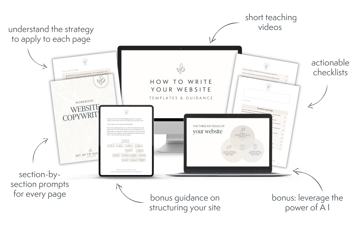 … your editable workbook contains all of the templates, prompts + checklists you need to write your website copy.
