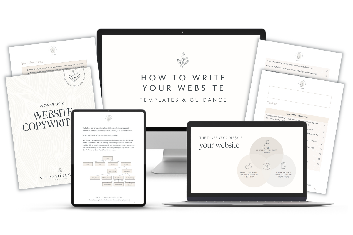 Useful workbook with section-by-section prompts for the key pages that you need on your website, checklists for every page, editable site structure map and reminders of key learning points for future reference.